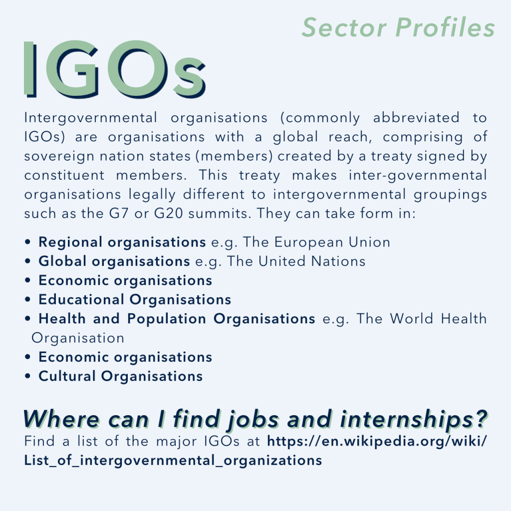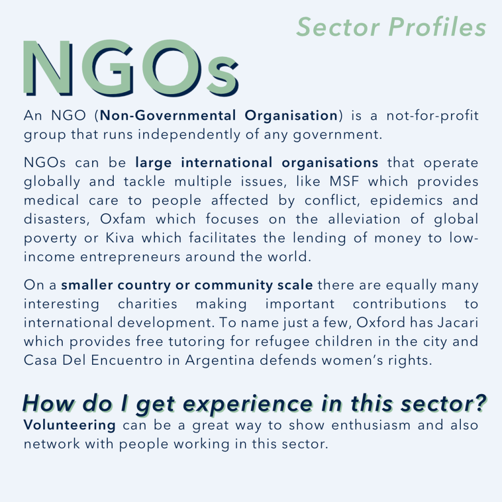 Thinking about a career in international development? There are loads of different areas and sectors that fall under the umbrella of international development, and many different career path possibilities!